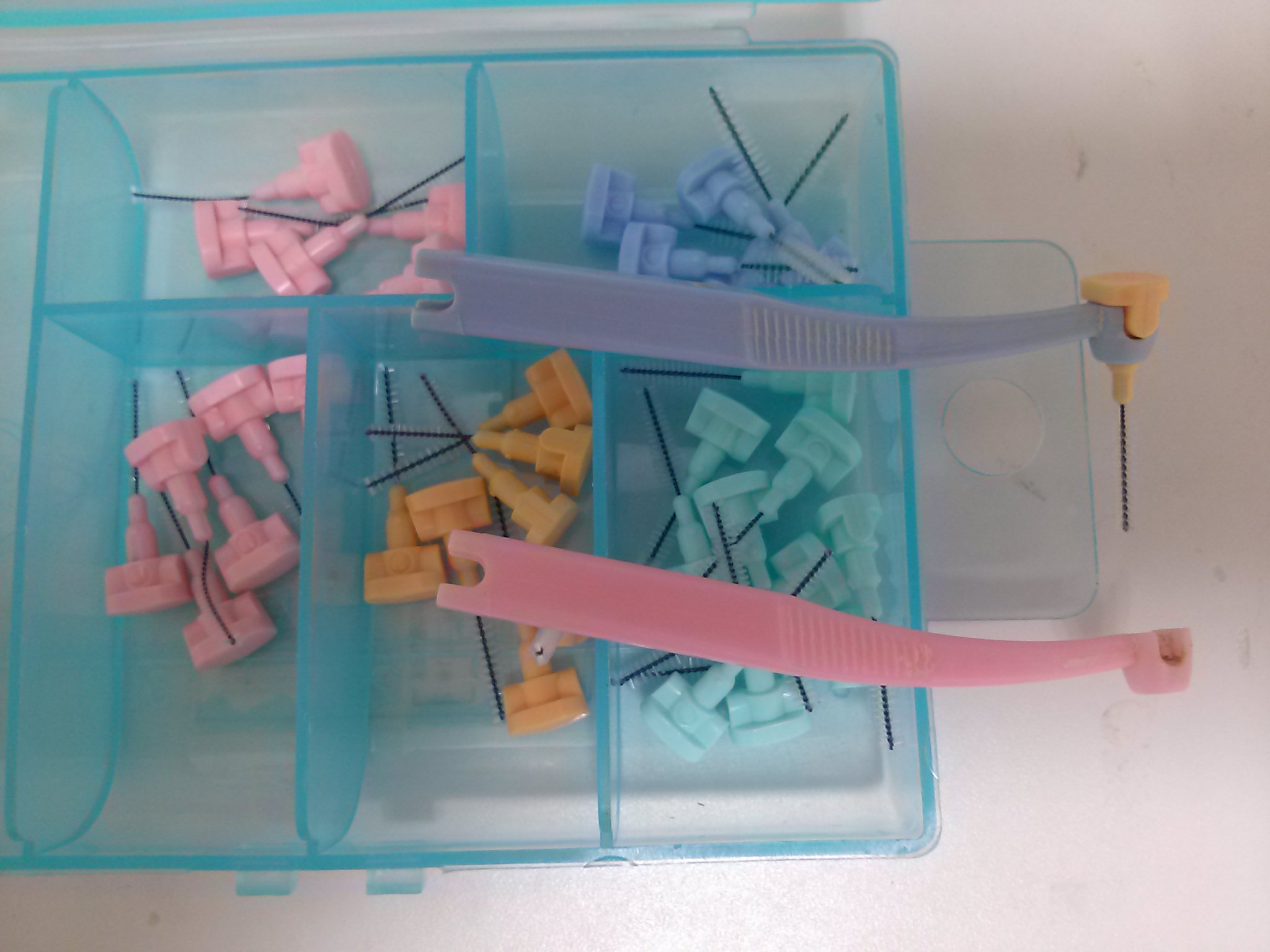 その他、クリーニング・メンテナンスに使うブラシや研磨カップも勿論患者さんごとに交換。 ブリッジなど歯と歯の間にフロス(糸)が通らない場合や、歯と歯の間の隙間が大きい場合に用いる歯間ブラシは、患者さんごとに廃棄(ディスポーザブル)です。IMG01725先端だけを交換できるもので、持つ部分は消毒します。これによりディスポでもコストを抑えますが、患者さんごとに破棄するディスポなのでこれもなかなか、他医院ではやっていないかと思います。 勿論、グローブ、紙コップ、エプロン、フロスもディズポの使い切りです。