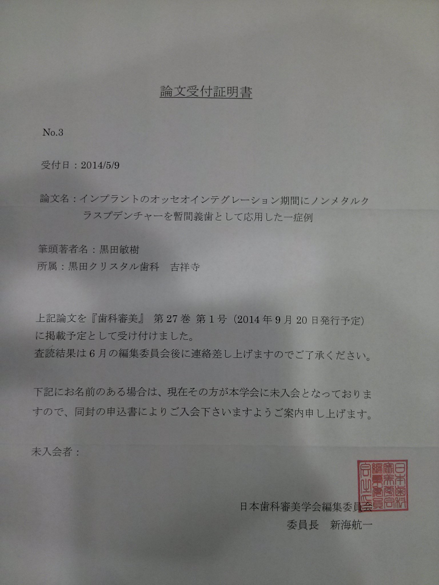 Web 予約 Tel : 0422-71-0984 Web予約 Tel:0422-71-0984 Top 診療案内 医院情報 院長とスタッフ紹介 医院内装・設備 診療の流れ 費用について アクセス・コンタクト 院長のメディア出演・活動実績 In English 医院からのお知らせ 院長ブログ 院長ブログ TOP ブログ 日本歯科審美学会 臨床論文投稿 2014年5月10日 【院長ブログ, 黒田クリスタル歯科 吉祥寺】 日本歯科審美学会 臨床論文投稿 昨年は、学会でポスター発表。今回は歯科審美雑誌に臨床論文を投稿致しました。査読と言って、論文として相応しいかの判定がまだありますので、掲載確定ではありませんが先ずは歯科審美学会にて受理して頂きました。 これは返事を待つとして。 次は今年26年の11月の日本歯科審美学会学術大会での発表に向けて準備します。 < 前の記事へ 次の記事へ > 最近の記事 クリスタルパークビル 外壁工事の為足場設置 黒田クリスタル歯科 吉祥寺 2026年1月 フレグランス パリス シック Paris Chic 2025 セミナー ウェビナー 学会 第36回 日本歯科審美学会学術大会 2025.12.12,13 日本歯科審美学会学術大会 理事会、学術大会出席につき院長不在 カテゴリ一覧 医院からのお知らせ 吉祥寺の話題 未分類 歯科の疑問 祭り 院長ブログ 黒クリ院長の休日 黒田クリスタル歯科 吉祥寺 月別 2026年1月 2025年12月 2025年11月 2025年10月 2025年9月 2025年8月 全月別 News 医院からのお知らせ 2026.01.13 クリスタルパークビル 外壁工事の為足場設置 2025.12.31 黒田クリスタル歯科 吉祥寺 2026年1月 フレグランス パリス シック Paris Chic 2025.12.11 2025.12.12,13 日本歯科審美学会学術大会 理事会、学術大会出席につき院長不在 2025.12.02 年末年始の休診日について 2025.11.29 黒田クリスタル歯科 吉祥寺 2025年12月 フレグランス フレグラント マグノリア Fragrant Magnolia 院長ブログ: 2025.12.31 2025 セミナー ウェビナー 学会 2025.12.15 第36回 日本歯科審美学会学術大会 2025.11.17 院長セミナー講演 日本歯科ボツリヌス協会 認定医取得講座 2025.10.22 東京歯科大学クラウンブリッジ補綴学講座 講演演者 黒田クリスタル歯科院長 BTAテクニック® 2025.09.08 日本アンチエイジング歯科学会 20周年