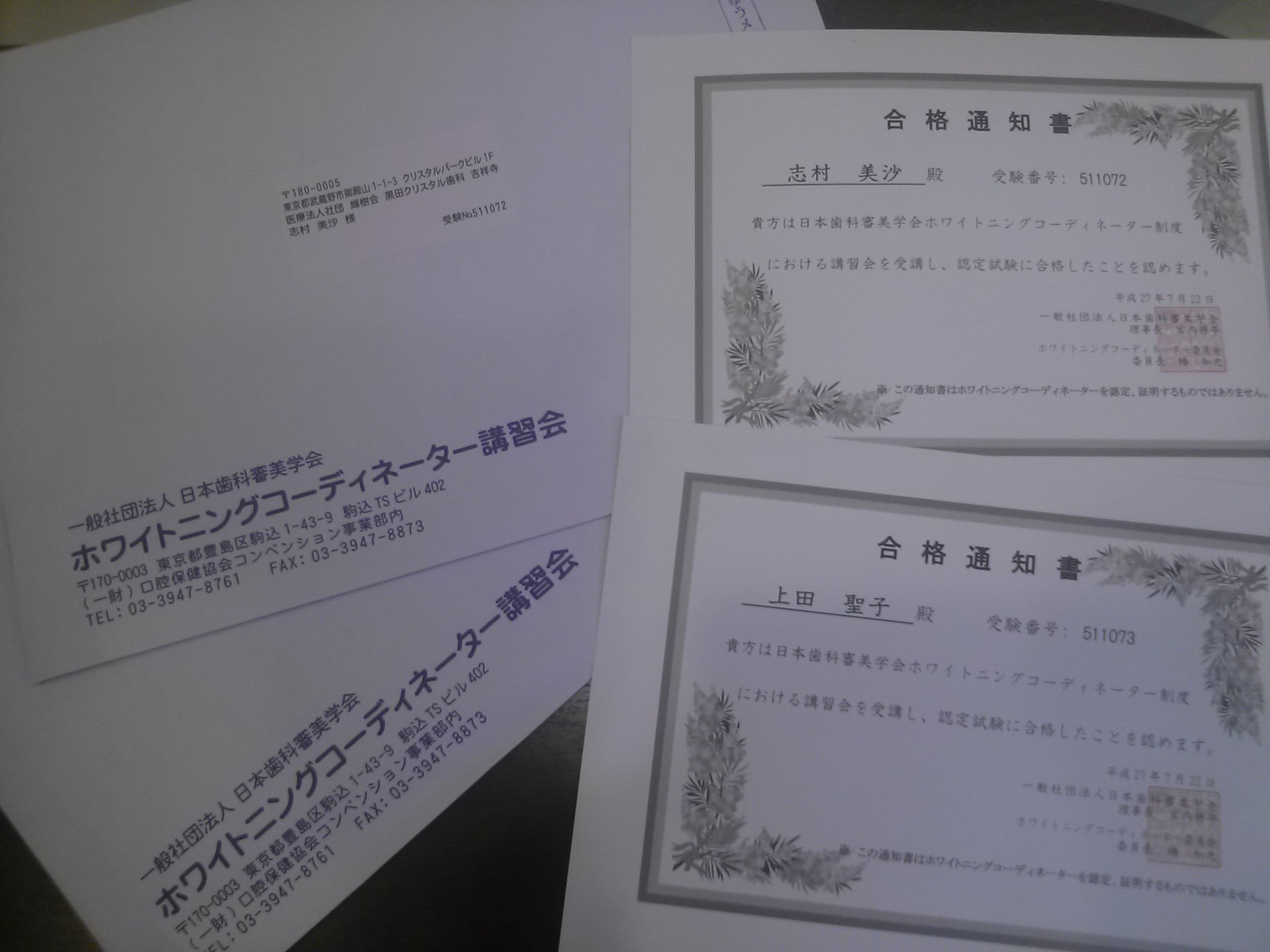 Web 予約 Tel : 0422-71-0984 Web予約 Tel:0422-71-0984 Top 診療案内 医院情報 院長とスタッフ紹介 医院内装・設備 診療の流れ 費用について アクセス・コンタクト 院長のメディア出演・活動実績 In English 医院からのお知らせ 院長ブログ 院長ブログ TOP ブログ 黒田クリスタル歯科 吉祥寺 歯科衛生士 ホワイトニングコーディネーター 認定試験 合格 2015年7月25日 【院長ブログ, 黒田クリスタル歯科 吉祥寺】 黒田クリスタル歯科 吉祥寺 歯科衛生士 ホワイトニングコーディネーター 認定試験 合格 先日 ブログで書きました、日本歯科審美学会主催のホワイトニングコーディネーターの認定試験の合格通知が届きました。 歯科衛生士 志村美沙と上田聖子 両名合格でした。 < 前の記事へ 次の記事へ > 最近の記事 クリスタルパークビル 外壁工事の為足場設置 黒田クリスタル歯科 吉祥寺 2026年1月 フレグランス パリス シック Paris Chic 2025 セミナー ウェビナー 学会 第36回 日本歯科審美学会学術大会 2025.12.12,13 日本歯科審美学会学術大会 理事会、学術大会出席につき院長不在 カテゴリ一覧 医院からのお知らせ 吉祥寺の話題 未分類 歯科の疑問 祭り 院長ブログ 黒クリ院長の休日 黒田クリスタル歯科 吉祥寺 月別 2026年1月 2025年12月 2025年11月 2025年10月 2025年9月 2025年8月 全月別 News 医院からのお知らせ 2026.01.13 クリスタルパークビル 外壁工事の為足場設置 2025.12.31 黒田クリスタル歯科 吉祥寺 2026年1月 フレグランス パリス シック Paris Chic 2025.12.11 2025.12.12,13 日本歯科審美学会学術大会 理事会、学術大会出席につき院長不在 2025.12.02 年末年始の休診日について 2025.11.29 黒田クリスタル歯科 吉祥寺 2025年12月 フレグランス フレグラント マグノリア Fragrant Magnolia 院長ブログ: 2025.12.31 2025 セミナー ウェビナー 学会 2025.12.15 第36回 日本歯科審美学会学術大会 2025.11.17 院長セミナー講演 日本歯科ボツリヌス協会 認定医取得講座 2025.10.22 東京歯科大学クラウンブリッジ補綴学講座 講演演者 黒田クリスタル歯科院長 BTAテクニック® 2025.09.08 日本アンチエイジング歯科学会 20周年