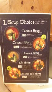 メニューから、先ずはスープを選ぶ(トマトスープ、ココナッツスープ、あっさりスープ、海老スープ、クリーミー海老スープ)