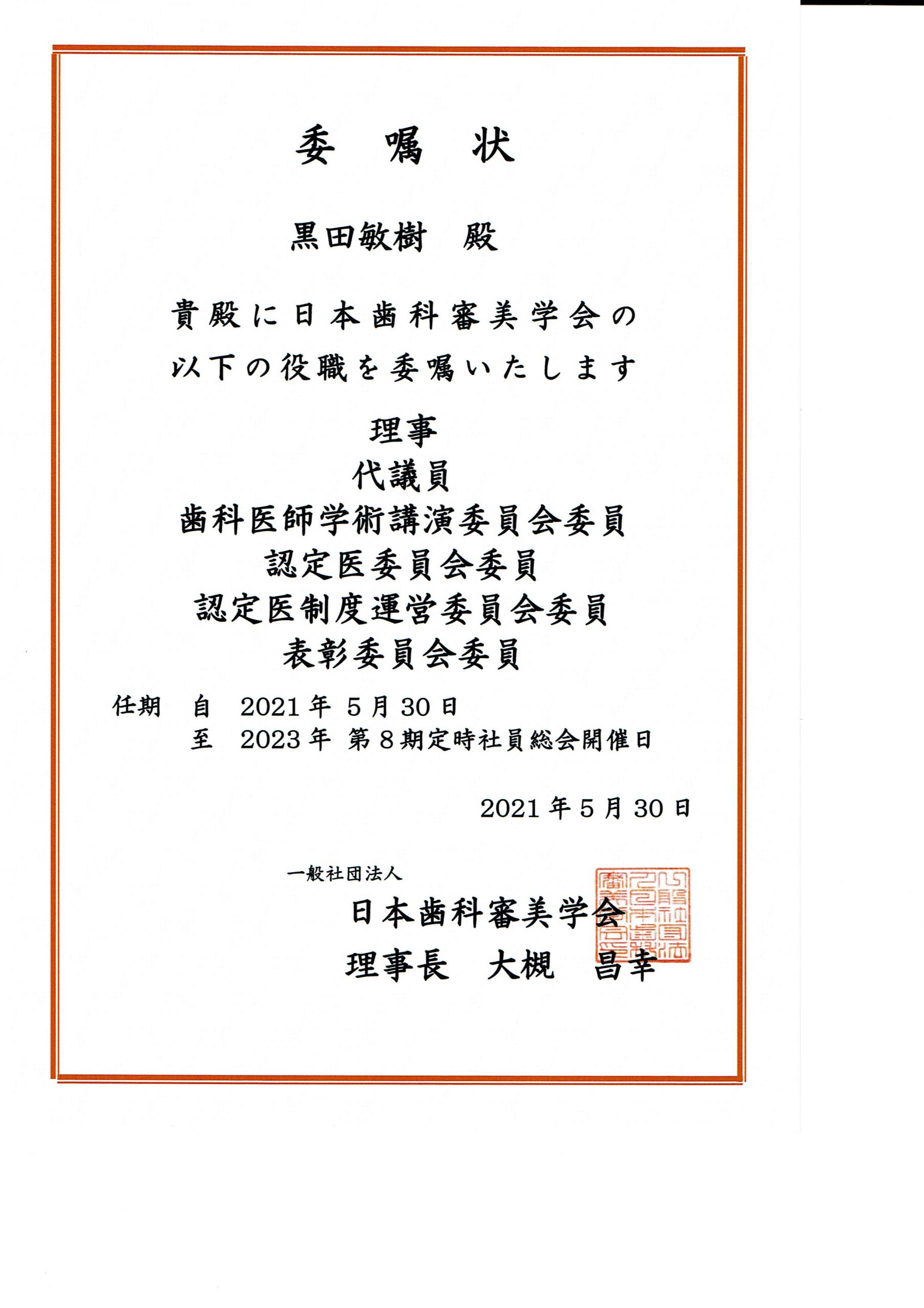 黒田クリスタル歯科 吉祥寺 2021.9.16 日本歯科審美学会認定医試験審議委員 院長不在