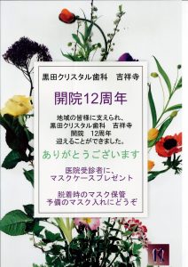 黒田クリスタル歯科 吉祥寺 12周年 マスクケースプレゼント