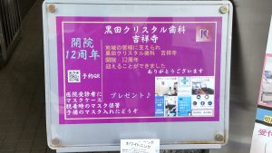Web 予約 Tel : 0422-71-0984 Web予約 Tel:0422-71-0984 Top 診療案内 医院情報 院長とスタッフ紹介 医院内装・設備 診療の流れ 費用について アクセス・コンタクト 院長のメディア出演・活動実績 In English 医院からのお知らせ 院長ブログ 院長ブログ TOP ブログ 黒田クリスタル歯科 吉祥寺 開院月 10月4日 12周年 2021年9月30日 【吉祥寺の話題, 院長ブログ, 黒田クリスタル歯科 吉祥寺】 黒田クリスタル歯科 吉祥寺 開院月 10月4日 12周年 黒田クリスタル歯科吉祥寺 10月 開院月 お陰様で、2021年10月4日で12周年を迎えることができます。 開院から沢山の患者さんに御来院頂き、地域に支えられ、また遠方からも御来院頂き、今日まで診療を続けられ嬉しい限りです。 ありがとうございます。 コロナ禍での診療は、より待ち時間のない診療、待合室から診療室まで、これまで以上に徹底した消毒・衛生環境により、コロナ感染拡大防止策を行っております。 しばらく、マスク生活が続きそうですので、12周年の感謝を込めまして、黒クリ受診者にマスクケースをプレゼント致します。 マスク脱着時の保管ケースとして、また、予備のマスク入れとしてなど、ご活用ください。 https://kuroda.kakunin.design/blog/news/6564/ < 前の記事へ 次の記事へ > 最近の記事 クリスタルパークビル 外壁工事の為足場設置 黒田クリスタル歯科 吉祥寺 2026年1月 フレグランス パリス シック Paris Chic 2025 セミナー ウェビナー 学会 第36回 日本歯科審美学会学術大会 2025.12.12,13 日本歯科審美学会学術大会 理事会、学術大会出席につき院長不在 カテゴリ一覧 医院からのお知らせ 吉祥寺の話題 未分類 歯科の疑問 祭り 院長ブログ 黒クリ院長の休日 黒田クリスタル歯科 吉祥寺 月別 2026年1月 2025年12月 2025年11月 2025年10月 2025年9月 2025年8月 全月別 News 医院からのお知らせ 2026.01.13 クリスタルパークビル 外壁工事の為足場設置 2025.12.31 黒田クリスタル歯科 吉祥寺 2026年1月 フレグランス パリス シック Paris Chic 2025.12.11 2025.12.12,13 日本歯科審美学会学術大会 理事会、学術大会出席につき院長不在 2025.12.02 年末年始の休診日について 2025.11.29 黒田クリスタル歯科 吉祥寺 2025年12月 フレグランス フレグラント マグノリア Fragrant Magnolia 院長ブログ: 2025.12.31 2025 セミナー ウェビナー 学会 2025.12.15 第36回 日本歯科審美学会学術大会 2025.11.17 院長セミナー講演 日本歯科ボツリヌス協会 認定医取得講座 2025.10.22 東京歯科大学クラウンブリッジ補綴学講座 講演演者 黒田クリスタル歯科院長 BTAテクニック® 2025.09.08 日本アンチエイジング歯科学会 20周年