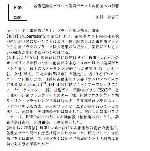 Web 予約 Tel : 0422-71-0984 Web予約 Tel:0422-71-0984 Top 診療案内 医院情報 院長とスタッフ紹介 医院内装・設備 診療の流れ 費用について アクセス・コンタクト 院長のメディア出演・活動実績 In English 医院からのお知らせ 院長ブログ 院長ブログ TOP ブログ 北海道 第55回日本歯周病学会春季学術大会 非常勤歯科医師 田村紗恵子 2012年5月19日 【黒田クリスタル歯科 吉祥寺】 北海道 第55回日本歯周病学会春季学術大会 非常勤歯科医師 田村紗恵子 本日、黒田クリスタル歯科 吉祥寺の非常勤歯科医師の田村紗恵子先生が北海道での、第55回日本歯周病学会春季学術大会 で発表してきました。 発表内容はは、歯ブラシと数種の電動歯ブラシにおける、歯周病原菌の検知数の比較のデータを元にした発表でした。 今後も歯周治療を始めとして歯科治療を、エビデンスとしっかりとした診断・手技をもって診療に生かしてくれる先生であると確信しております。 < 前の記事へ 次の記事へ > 最近の記事 クリスタルパークビル 外壁工事の為足場設置 黒田クリスタル歯科 吉祥寺 2026年1月 フレグランス パリス シック Paris Chic 2025 セミナー ウェビナー 学会 第36回 日本歯科審美学会学術大会 2025.12.12,13 日本歯科審美学会学術大会 理事会、学術大会出席につき院長不在 カテゴリ一覧 医院からのお知らせ 吉祥寺の話題 未分類 歯科の疑問 祭り 院長ブログ 黒クリ院長の休日 黒田クリスタル歯科 吉祥寺 月別 2026年1月 2025年12月 2025年11月 2025年10月 2025年9月 2025年8月 全月別 News 医院からのお知らせ 2026.01.13 クリスタルパークビル 外壁工事の為足場設置 2025.12.31 黒田クリスタル歯科 吉祥寺 2026年1月 フレグランス パリス シック Paris Chic 2025.12.11 2025.12.12,13 日本歯科審美学会学術大会 理事会、学術大会出席につき院長不在 2025.12.02 年末年始の休診日について 2025.11.29 黒田クリスタル歯科 吉祥寺 2025年12月 フレグランス フレグラント マグノリア Fragrant Magnolia 院長ブログ: 2025.12.31 2025 セミナー ウェビナー 学会 2025.12.15 第36回 日本歯科審美学会学術大会 2025.11.17 院長セミナー講演 日本歯科ボツリヌス協会 認定医取得講座 2025.10.22 東京歯科大学クラウンブリッジ補綴学講座 講演演者 黒田クリスタル歯科院長 BTAテクニック® 2025.09.08 日本アンチエイジング歯科学会 20周年