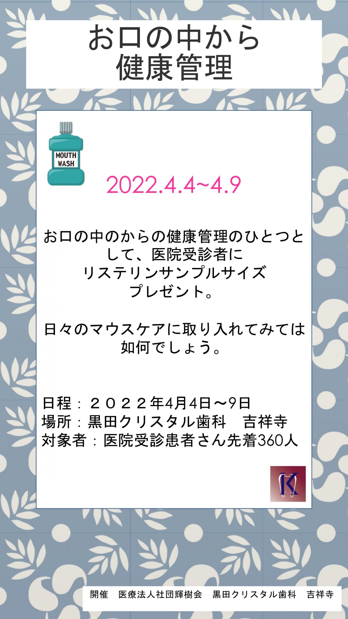Web 予約 Tel : 0422-71-0984 Web予約 Tel:0422-71-0984 Top 診療案内 医院情報 院長とスタッフ紹介 医院内装・設備 診療の流れ 費用について アクセス・コンタクト 院長のメディア出演・活動実績 In English 医院からのお知らせ 院長ブログ 院長ブログ TOP ブログ 2022.4.4~4.9 医院受診者に リステリンプレゼント お口の中のからの健康管理のひとつと して 2022年3月30日 【医院からのお知らせ, 吉祥寺の話題, 歯科の疑問, 黒田クリスタル歯科 吉祥寺】 2022.4.4~4.9 医院受診者に リステリンプレゼント お口の中のからの健康管理のひとつと して 2022.4.4~4.9 お口の中のからの健康管理のひとつとして、医院受診者に リステリンサンプルサイズ プレゼント。 日々のマウスケアに取り入れてみては如何でしょう。 日程:2022年4月4日~9日 場所:黒田クリスタル歯科 吉祥寺 対象者:医院受診患者さん先着360人 < 前の記事へ 次の記事へ > 最近の記事 クリスタルパークビル 外壁工事の為足場設置 黒田クリスタル歯科 吉祥寺 2026年1月 フレグランス パリス シック Paris Chic 2025 セミナー ウェビナー 学会 第36回 日本歯科審美学会学術大会 2025.12.12,13 日本歯科審美学会学術大会 理事会、学術大会出席につき院長不在 カテゴリ一覧 医院からのお知らせ 吉祥寺の話題 未分類 歯科の疑問 祭り 院長ブログ 黒クリ院長の休日 黒田クリスタル歯科 吉祥寺 月別 2026年1月 2025年12月 2025年11月 2025年10月 2025年9月 2025年8月 全月別 News 医院からのお知らせ 2026.01.13 クリスタルパークビル 外壁工事の為足場設置 2025.12.31 黒田クリスタル歯科 吉祥寺 2026年1月 フレグランス パリス シック Paris Chic 2025.12.11 2025.12.12,13 日本歯科審美学会学術大会 理事会、学術大会出席につき院長不在 2025.12.02 年末年始の休診日について 2025.11.29 黒田クリスタル歯科 吉祥寺 2025年12月 フレグランス フレグラント マグノリア Fragrant Magnolia 院長ブログ: 2025.12.31 2025 セミナー ウェビナー 学会 2025.12.15 第36回 日本歯科審美学会学術大会 2025.11.17 院長セミナー講演 日本歯科ボツリヌス協会 認定医取得講座 2025.10.22 東京歯科大学クラウンブリッジ補綴学講座 講演演者 黒田クリスタル歯科院長 BTAテクニック® 2025.09.08 日本アンチエイジング歯科学会 20周年