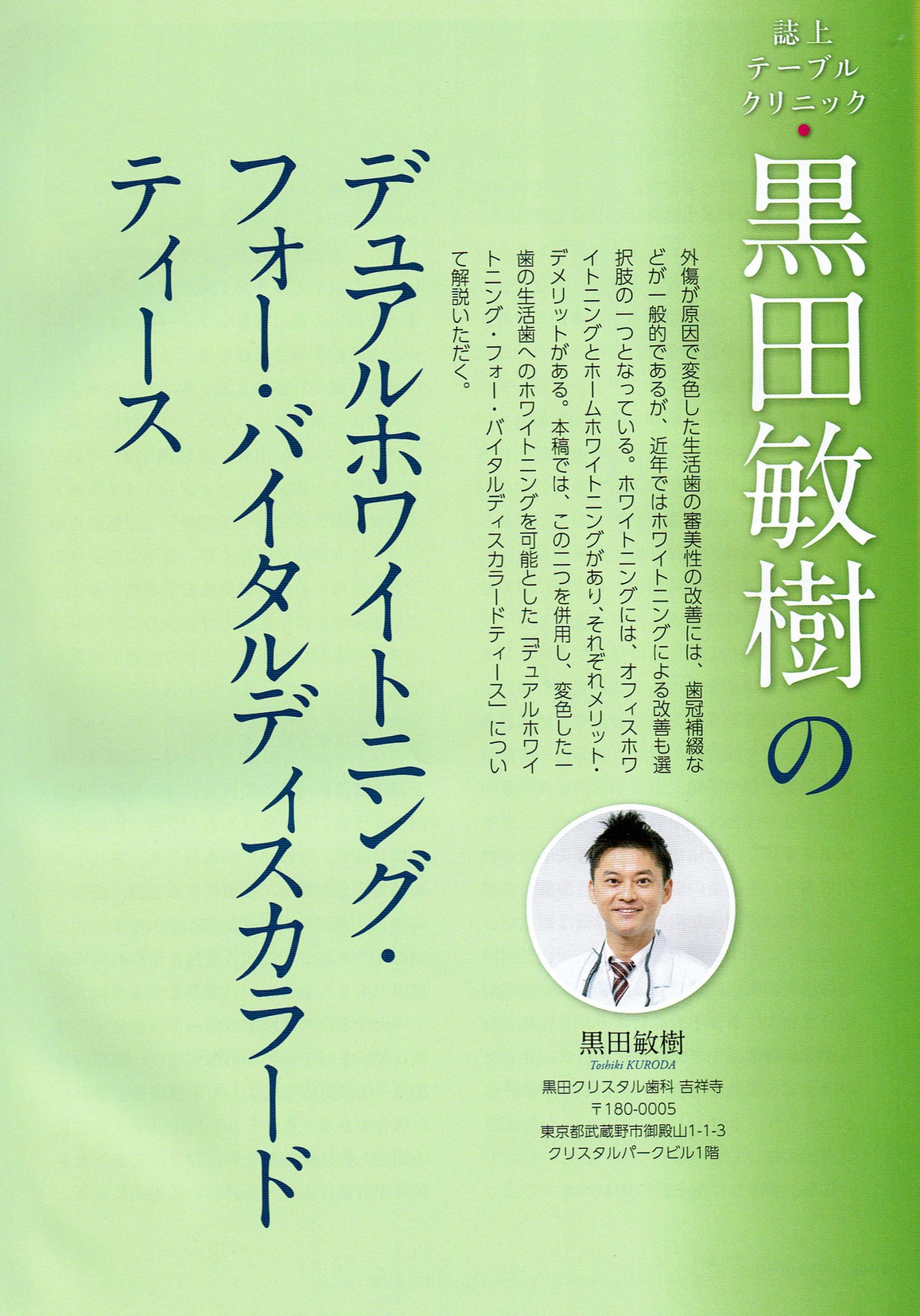 この中の、10月号の治療後編のQ4の「もう一度ホワイトニングしたいのですが?」で黒田クリスタル歯科 吉祥寺院長 黒田が、2ページ執筆させて頂きました。