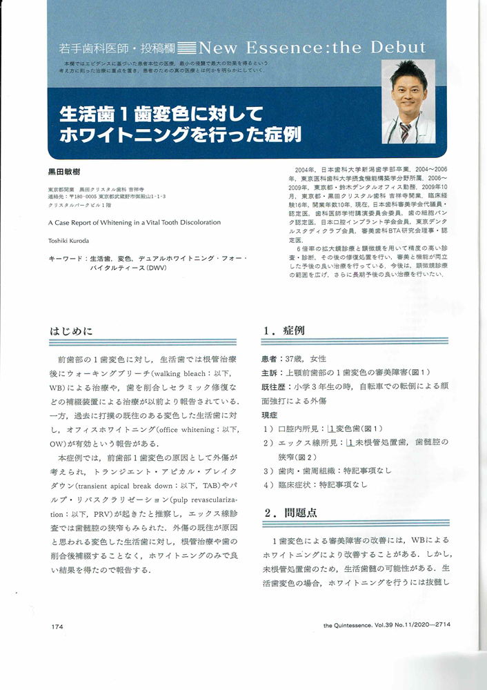 歯科の月間機関紙 クイント 11月号に 黒田敏樹の【生活歯1歯変色に対してホワイトニングを行った症例】が掲載されました。