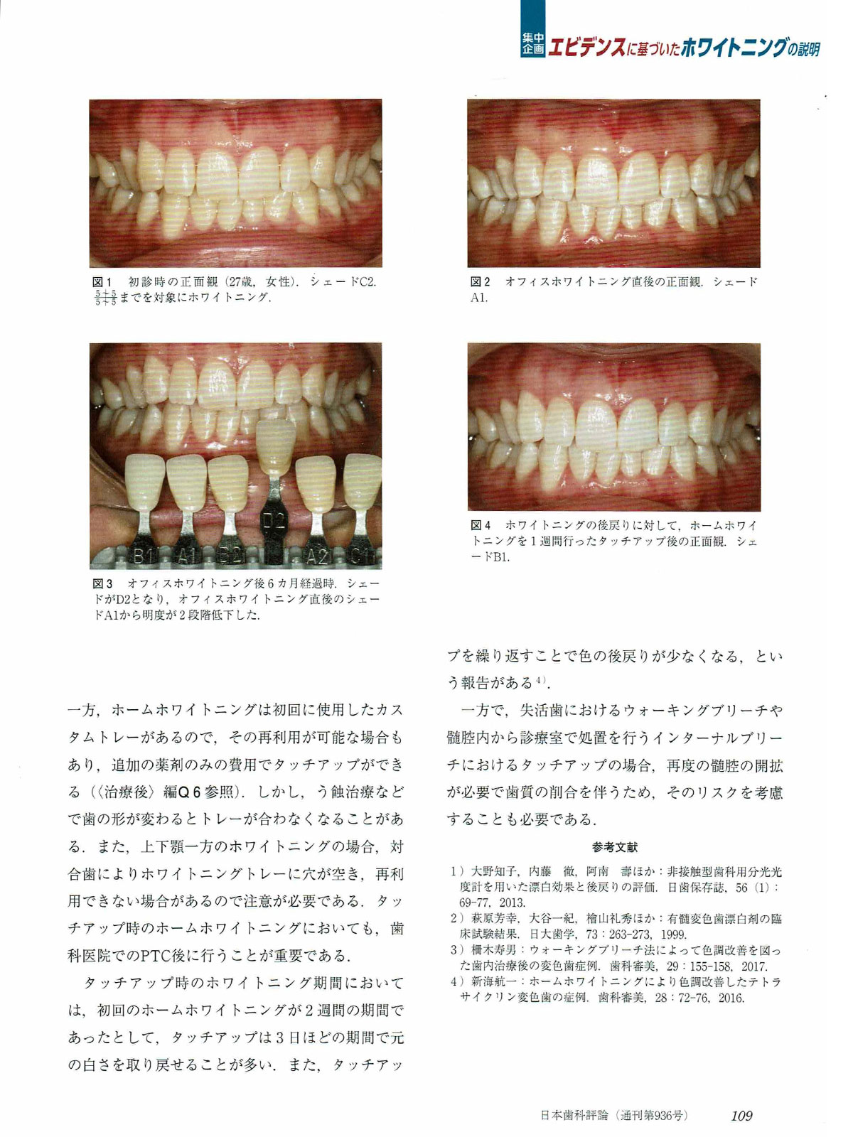 歯科の月間機関紙 歯科評論の特集で3巻にわたる ホワイトニング特集(7月号8月号10月号にわたり、治療前、治療中、治療後)のエビデンスに基づいた説明の歯科医師・歯科衛生士向けのホワイトニングQ&A