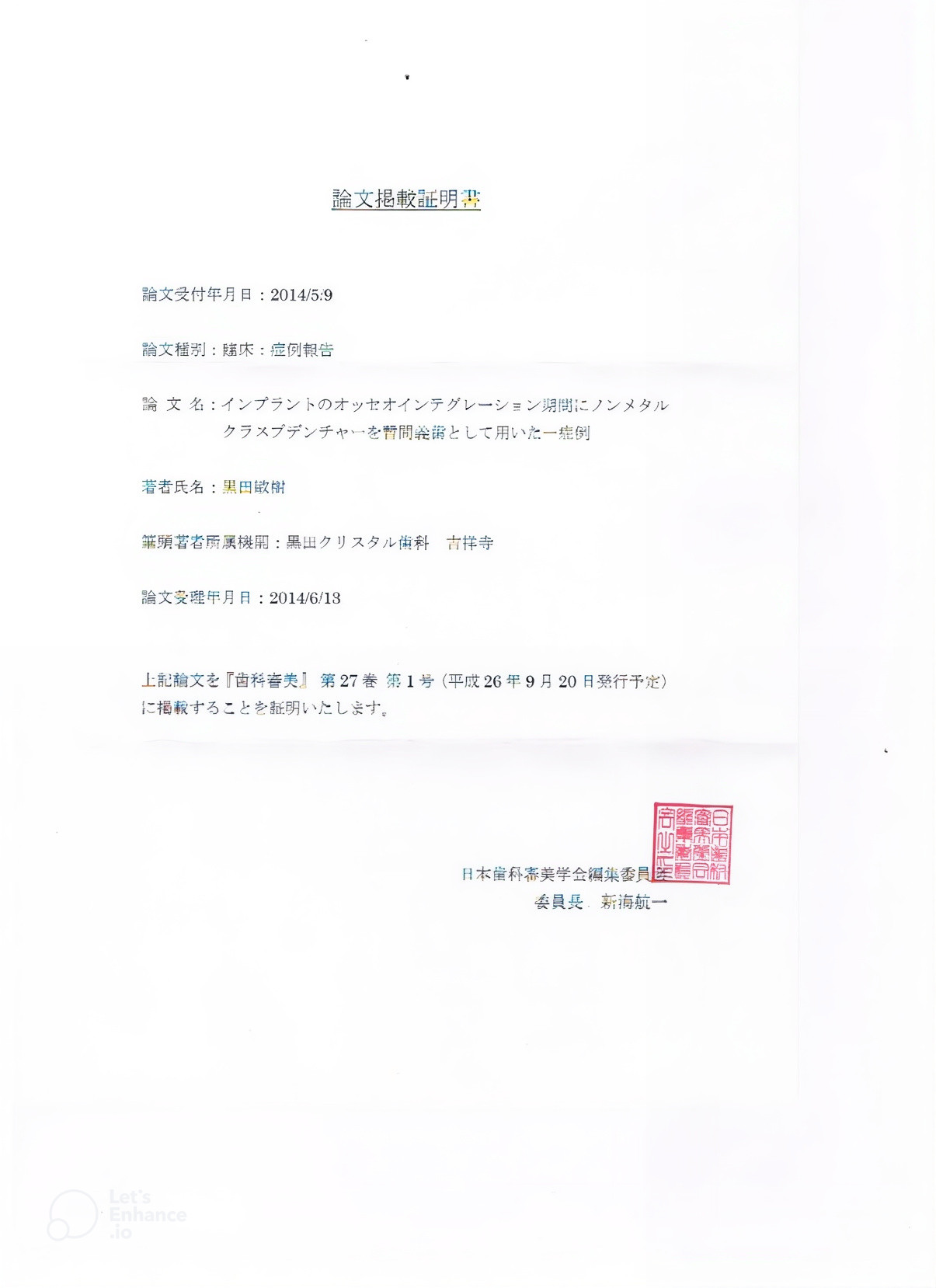 2013年のポスター発表について、日本歯科審美学会誌へ臨床論文投稿を薦められ2014.9.20発刊 学会誌 歯科審美 掲載