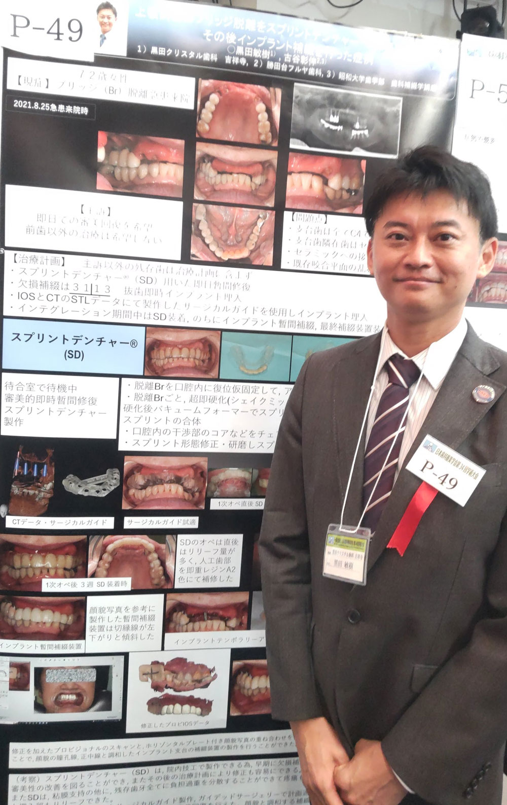 上顎前歯部ブリッジの土台ごと脱離による審美障害を主訴に来院した患者さんに対し、来院当日にスプリントデンチャーで即日暫間審美回復を行い、その後、口腔内スキャナー(IOS)を用いて、サージカルガイドプレートを用いたインプラント手術を行い、その後インプラントにセラミックを製作し、良い結果を得た内容を学会発表致しました。プラントにセラミックを製作し、良い結果を得た内容を学会発表致しました。