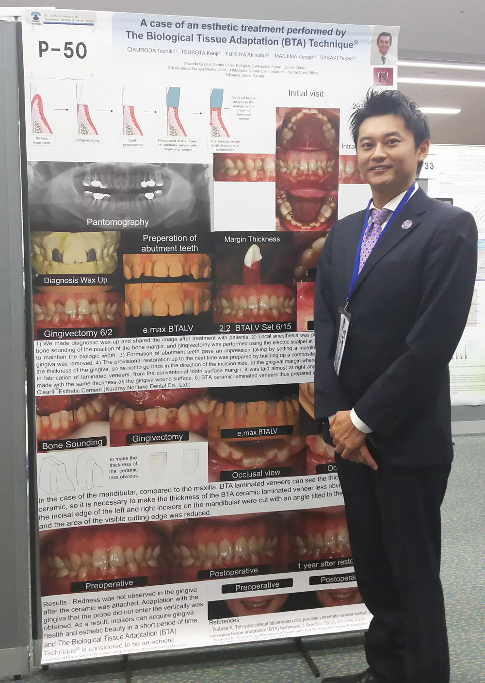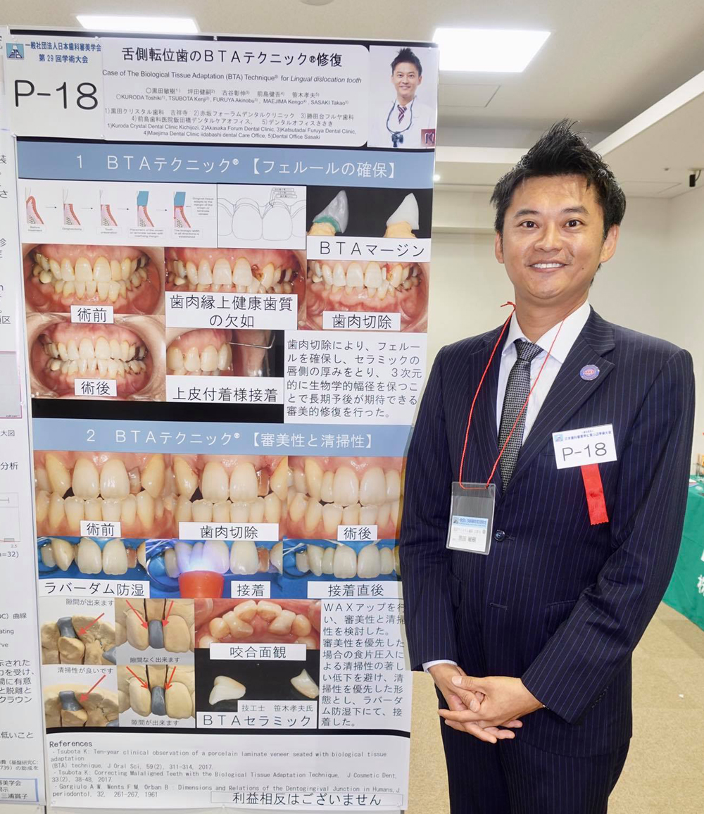 もう一つは、従来であれば矯正治療で2年前後の治療が必要な治療、もしくは抜歯してインプラントやブリッジといった期間的にも、費用的にも多くなってしまう症例に対して BTA TechniqueR を持ちいて、審美的に、また歯ブラシもしやすい形にセラミック修復した症例についてを大判のポスターを用いて学会発表致しました。 -