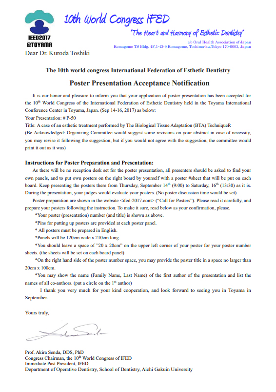 2017年 第10回 国際歯科審美学会世界大会での、ポスター発表が受理されました。