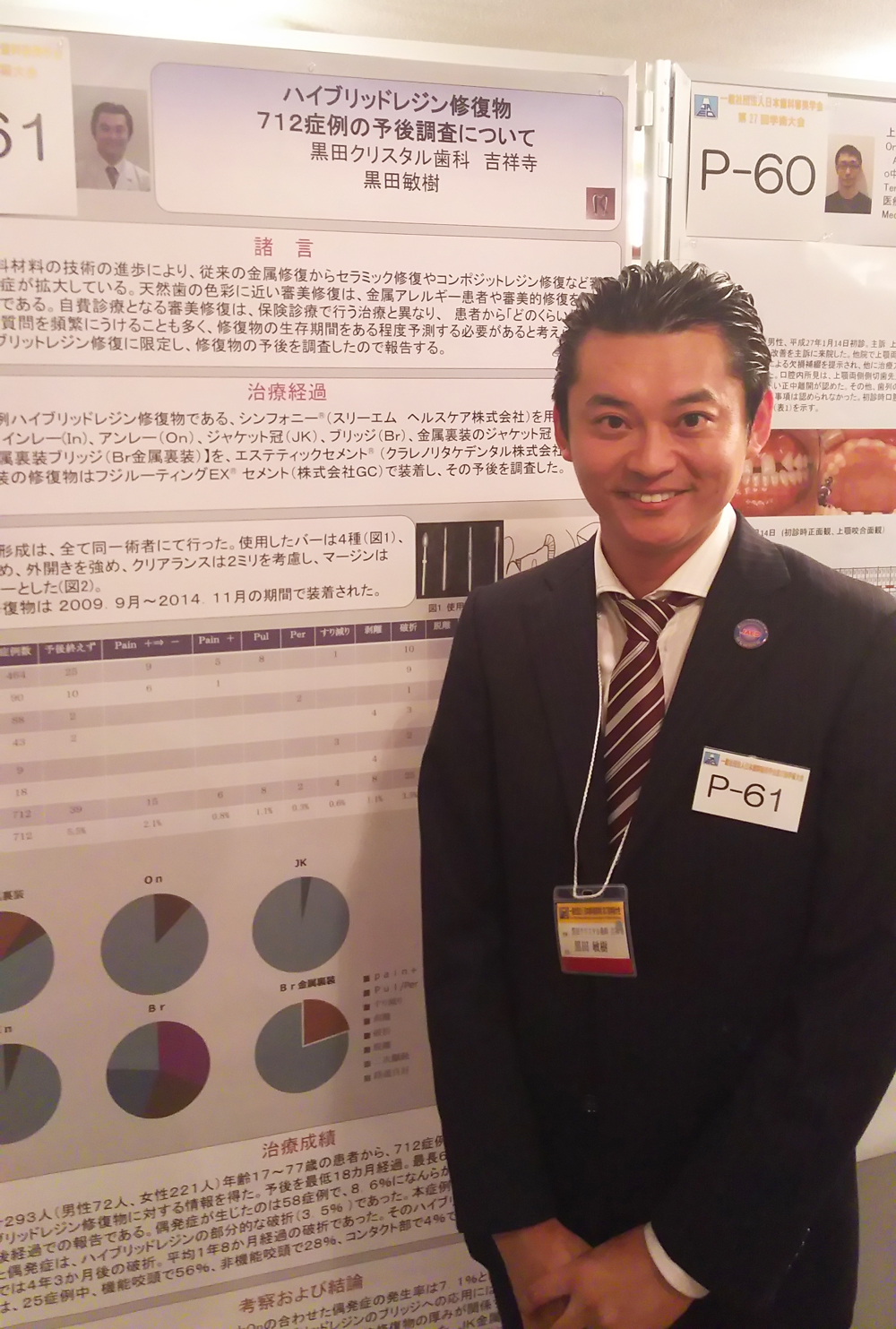 黒田クリスタル歯科 吉祥寺でのハイブリッドレジンセラミックがどれだけ、保つのかを、2009年9月1日から2014年11月30日までに装着し、その経過を最低18カ月、最長6年7か月。平均して3年9か月の期間観察し、経過がどれだけ良いのかを、集計しました。結果、よく使われる方法では、93.4%が良好な結果となり、ハイブリッドレジンセラミックが良い経過を辿ることの出来る修復物であることが示唆された症例についての1症例を大判のポスターを用いて学会発表致しました。
