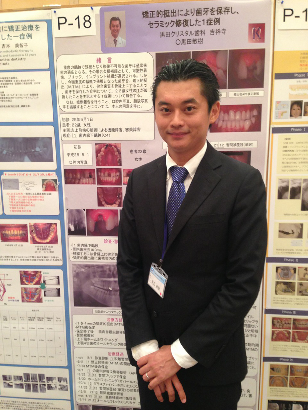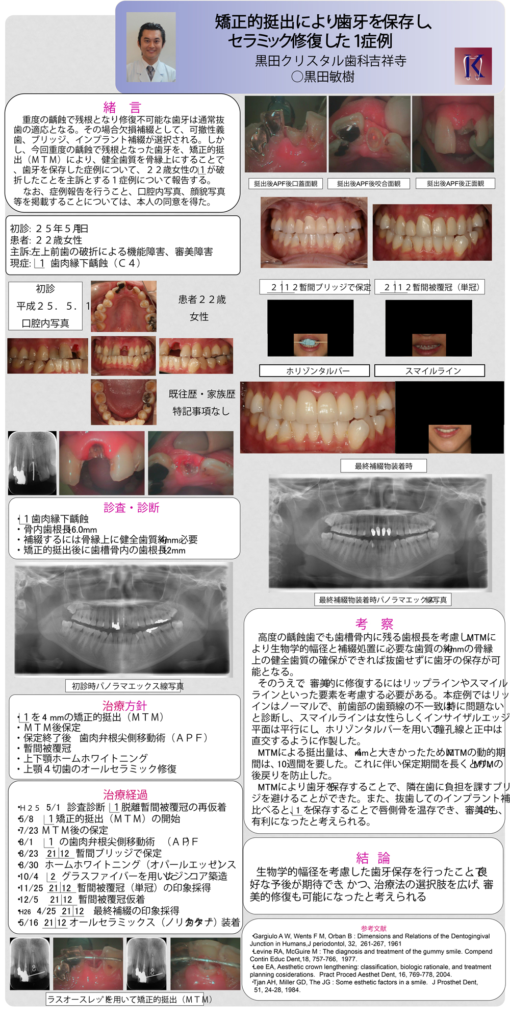 高度の虫歯で歯の根っこだけとなり、修復不可能な歯は通常抜歯のとなる。その後の治療として、歯を失ったところには、取り外し式の部分入れや両隣りの歯を削ってブリッジにするか,骨の中にインプラントを入れるかの治療が必要となる。しかし、今回の発表では、部分的な矯正により、健康な歯を引出して歯を残すことに成功し、かつセラミックの被せ物によって、より綺麗にすることが出来た症例についての1症例を大判のポスターを用いて学会発表致しました。